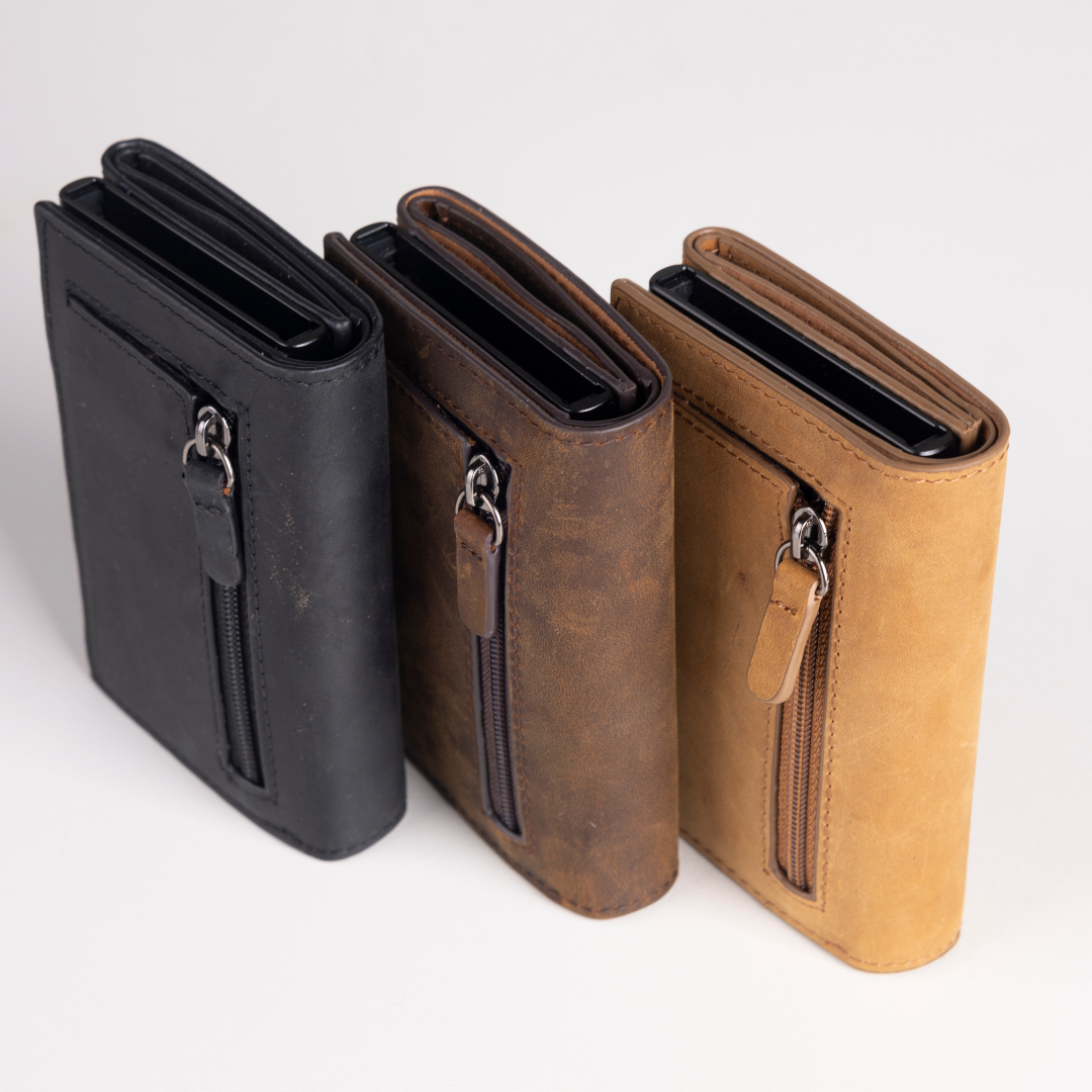 Billetera tarjetero: Estilo moderno confeccionado en cuero con estilo vintage. El tarjetero es de Aluminio, dando durabilidad y calidad